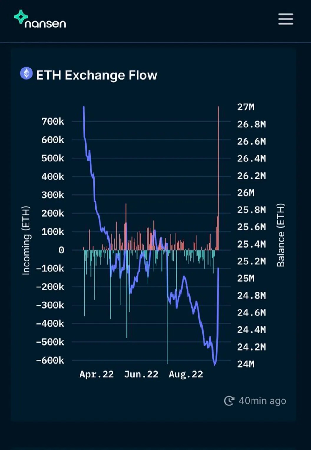 В преддверии этого события резко усилился приток эфира (ETH) на криптовалютные биржи. В общей сложности инвесторы отправили на торговые площадки ETH на сумму до $1,2 млрд - это максимальное поступление на биржевые кошельки за последние шесть месяцев, подчеркнул гендиректор Nansen Алекс Сваневик.