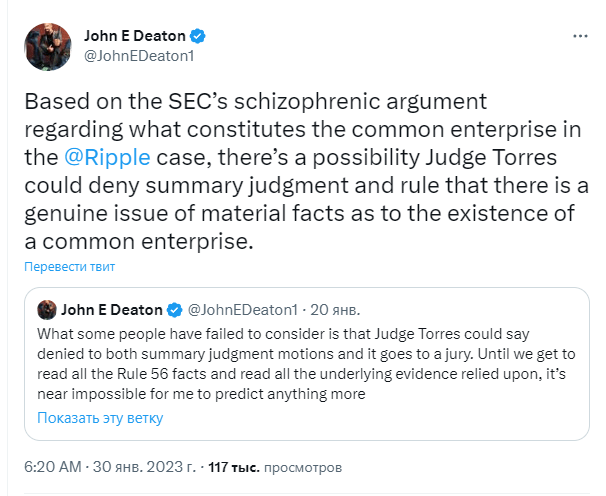 Основатель Crypto Law и управляющий партнёр Deaton Law Firm Джон Э. Дитон опубликовал серию твитов, в которых обсуждался «шизофренический аргумент Комиссии по ценным бумагам и биржам США относительно того, что представляет собой обычное предприятие в деле Ripple».