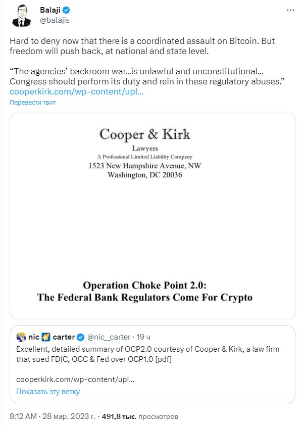 Бывший технический директор Coinbase Баладжи Шринивасан написал в Твиттере (соцсеть запрещена на территории России) об операции «Удушающая точка 2.0».